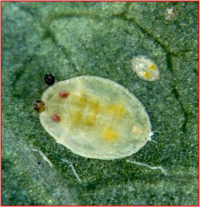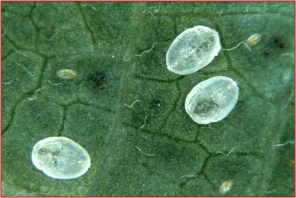Det er ett bevegelig og tre ubevegelige nymfestadier. Alle har oval og flat kropp som har en ytre rand av voksfrynser som er tydeligst i de yngste stadiene. Nymfene i første stadium er ca. 0.25 mm lange. De har velutviklede bein og antenner og kan vandre rundt på bladet (kalles gjerne vandrenymfer). I løpet av de tre neste nymfestadiene blir kroppen ca. 0.5 mm lang. Beina og antennene blir tilbakedannet, slik at nymfene til slutt sitter på et sted resten av sin utviklingstid. Kroppen hos de tre første nymfestadiene er nesten gjennomsiktig bortsett fra et par gule flekker på bakre halvdel, som blir synlig gjennom huden etter hvert som nymfene utvikler seg. De to første nymfestadiene er vanskelig å se med det blotte øye.