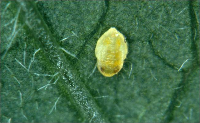 Det fjerde nymfestadiet gjennomgår tre understadier. De voksne mellusene av neste generasjon blir dannet i det siste understadiet som kalles puparium. Kroppen blir da mer oval (ca. 0.8 mm x 0.6 mm) og fortykket, med en mer eller mindre uregelmessig kant avhengig av bladbehåringen. Behåringen på ryggen er sparsom, spesielt på glatte blad. På blad med hår kan pupariene ha 2-8 lange hår. Pupariehuden er gjennomsiktig, slik at de røde øynene og det gule kroppspigmentet til de nye voksne mellusene er godt synlig. De fullvoksne mellusene kryper ut gjennom et T-formet snitt i pupariet, som blir sittende igjen som ett gjennomsiktig skall.