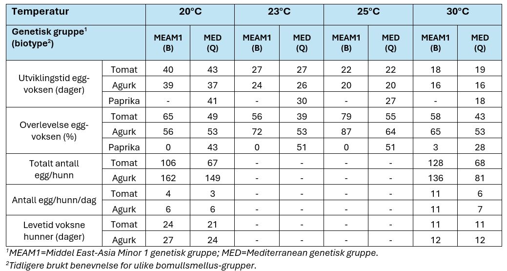 Tabell 1. Gjennomsnittlig utviklingstid, overlevelse og eggproduksjon ved forskjellige konstante temperaturer hos bomullsmellus på ulike vertplanter (Kilde: Tsueda & Tsuchida, 2011)