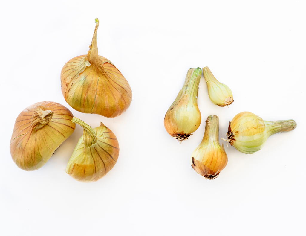 Avlingen av sjalottløk fra virusfrie planter (til venstre) er tydelig større enn når plantene er virusinfisert (til høyre). (Foto: Dag-Ragnar Blystad / NIBIO)