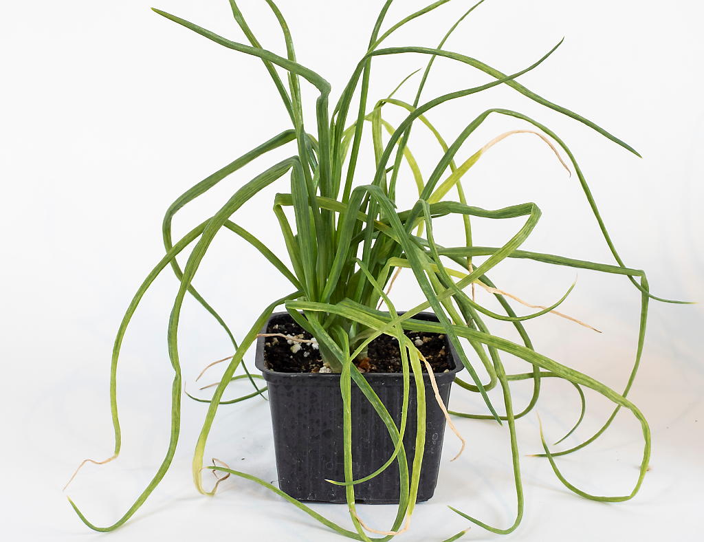 Sjalottløk infisert med løkgulmosaikkvirus har blader med gule, uregelmessige striper, og er i tillegg utoverliggende og vinglete. (Foto: Dag-Ragnar Blystad / NIBIO)