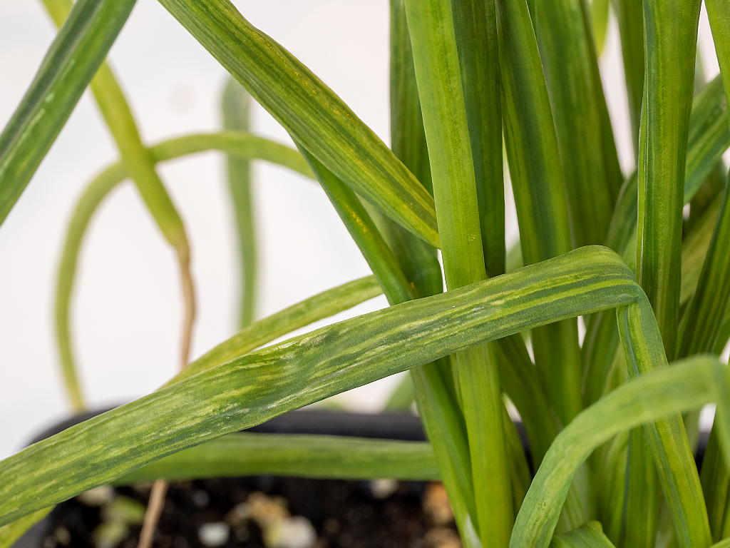 Løkgulmosaikkvirus gir gule, uregelmessige striper i bladene på infiserte planter. (Foto: Dag-Ragnar Blystad / NIBIO)