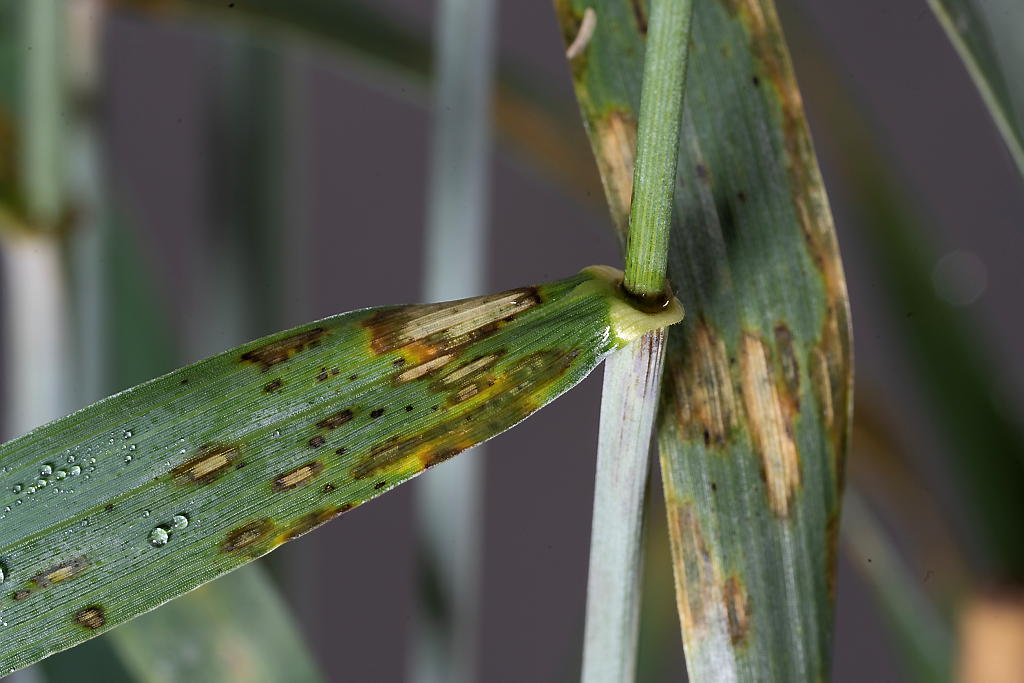 Hveteblad infisert med Microdochium spp. (sees som brune flekker med et avbleket område i midten av flekken). (Foto: E. Fløistad, NIBIO)