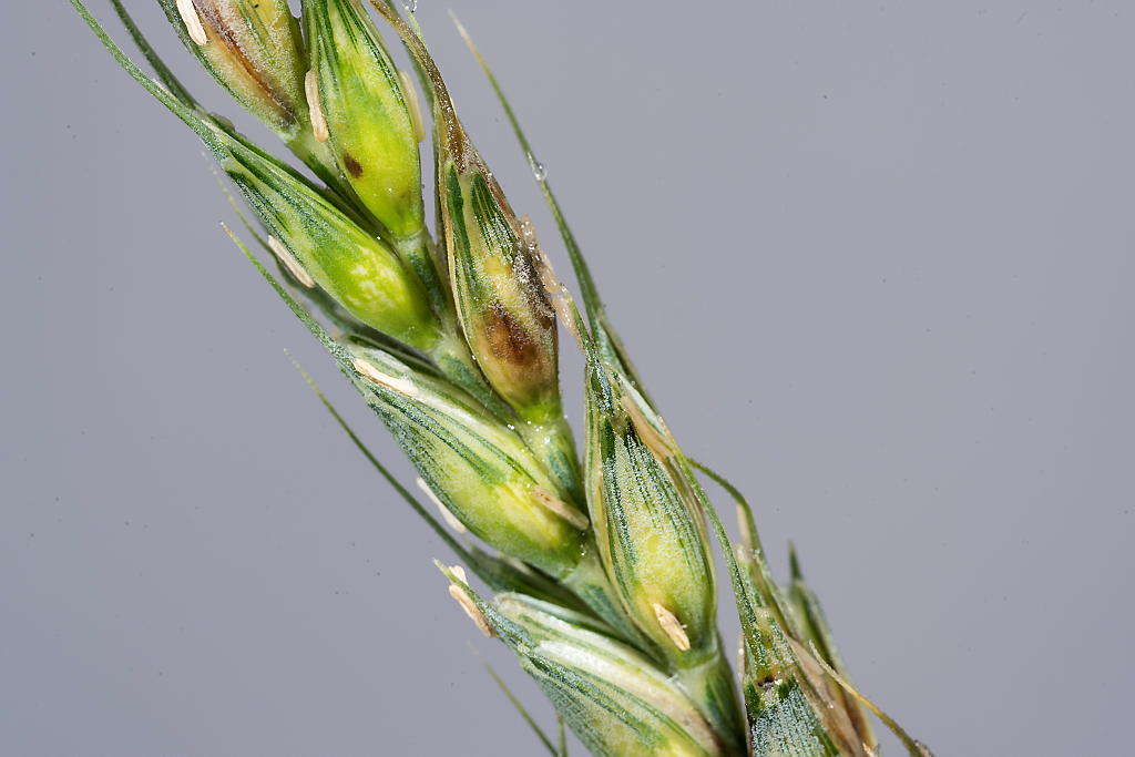 Hveteaks infisert med Microdochium spp. (sees som brune flekker på småaks). (Foto: E. Fløistad, NIBIO)